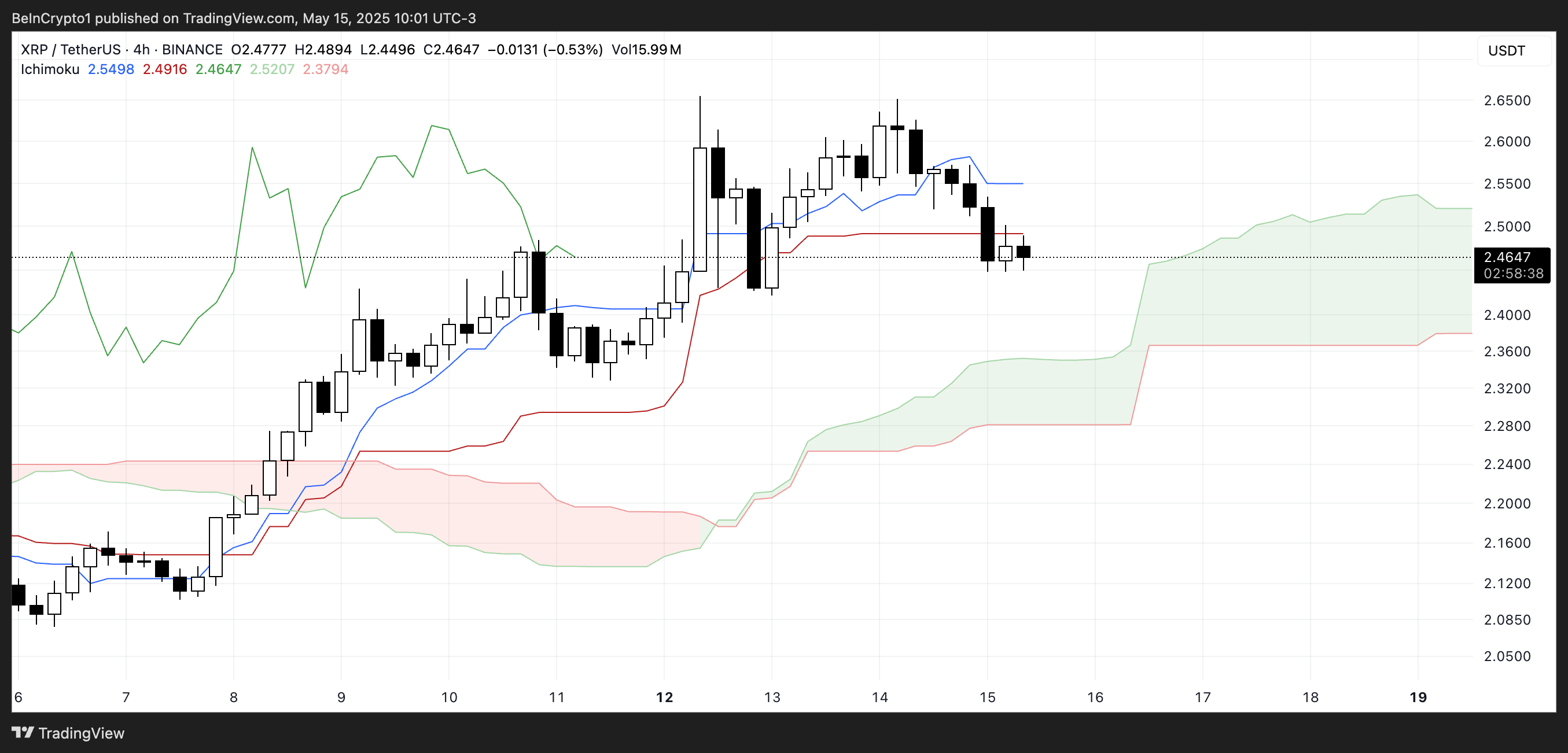 XRP mencatat apresiasi harga 10% dalam tujuh hari terakhir. Namun pada Kamis (15/5), harganya terkoreksi 4,6%. Hal ini mengindikasikan pergeseran momentum yang kian kentara. RSI kini berada di bawah 50, indikator Ichimoku menunjukkan harga tergelincir di bawah garis support utama, dan celah antara garis EMA juga mulai menyempit—semuanya memberi sinyal kekuatan jangka pendek tengah melemah.