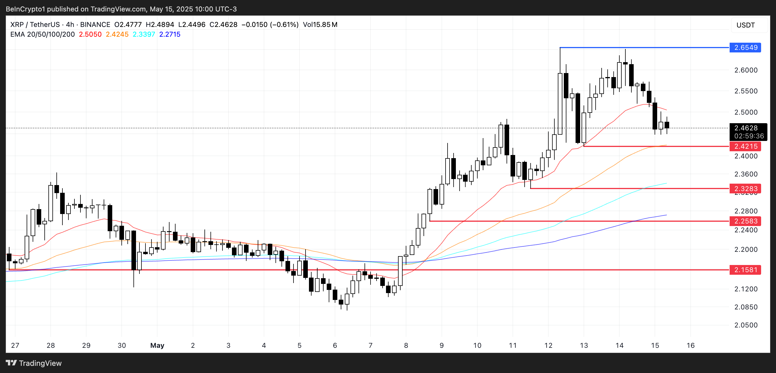 Namun, celah di antara garis-garis tersebut kini semakin tipis, mengisyaratkan potensi pelemahan momentum. Kompresi ini menyiratkan bahwa dominasi bull mulai terkikis, dan jika XRP gagal menjaga support terdekat di level US$2,42, maka koreksi lebih dalam bisa saja terjadi.