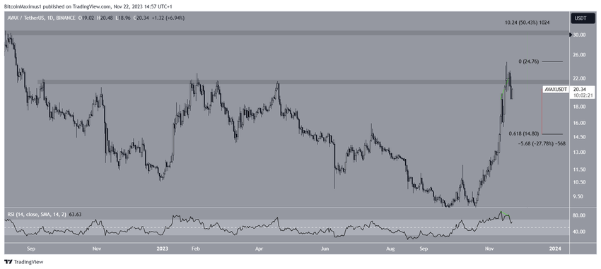 Jika itu benar terjadi, harga AVAX terancam anjlok 30% ke level support Fibonacci retracement 0,618 di US$14,80.