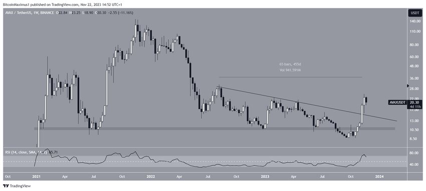 Harga Avalanche (AVAX) berhasil breakout dari garis tren descending resistance 455 hari dua minggu lalu.