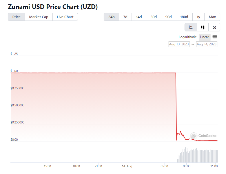 Merespon peristiwa tersebut, pergerakan harga token Zunami USD (UZD) langsung ambles 99%. Harga token UZD rontok ke level US$0,01139450 pada perdagangan hari ini, meninggalkan posisi sebelumnya yang masih stabil di kisaran US$0,994801.