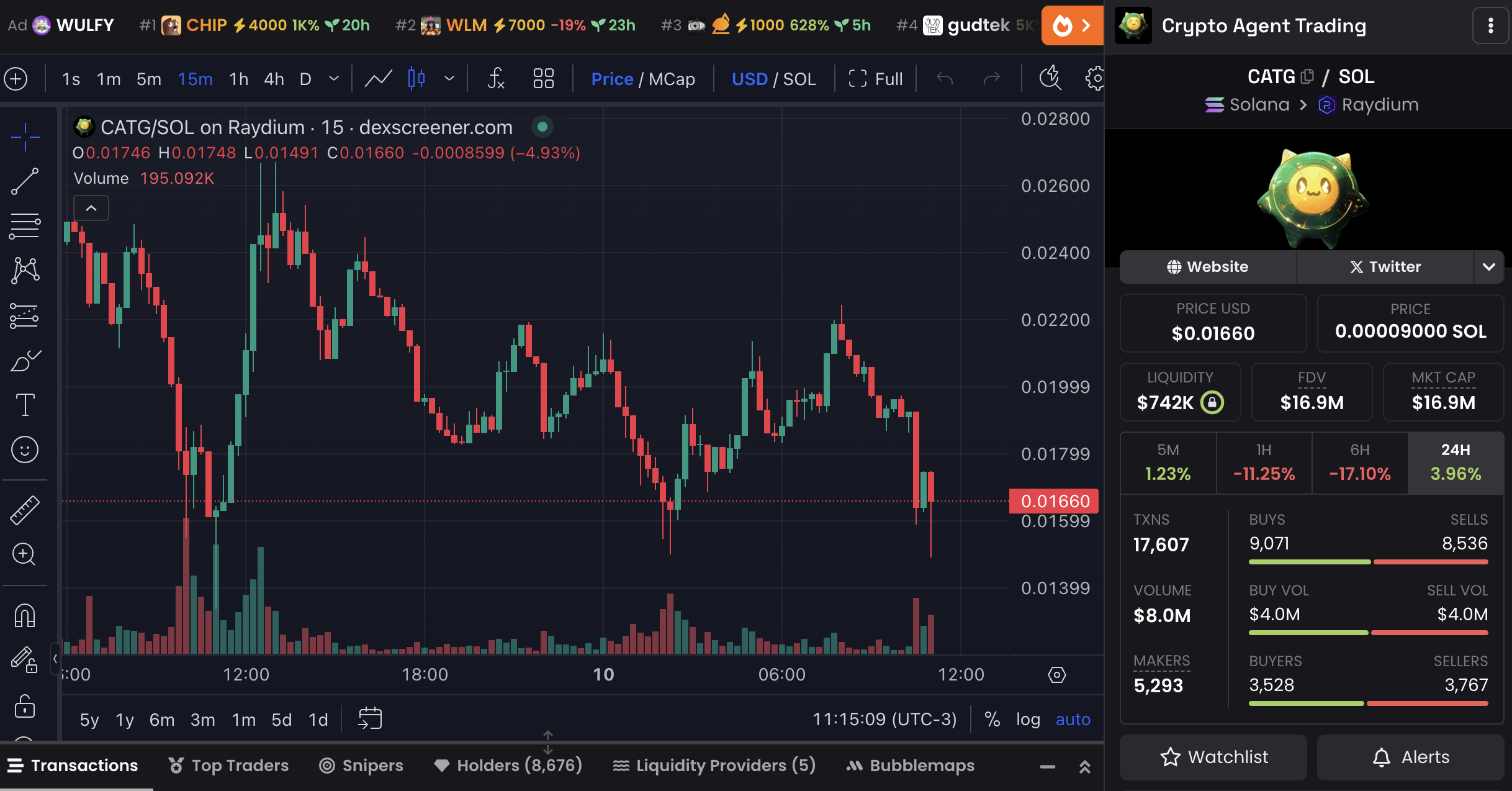 SponsoredTiga hari setelah peluncuran, CATG telah mengumpulkan lebih dari 8.600 holder. Dengan volume perdagangan harian sekitar US$7,9 juta, momentum koin ini tetap solid. Saat ini, kapitalisasi pasar CATG tercatat sebesar US$16,7 juta.