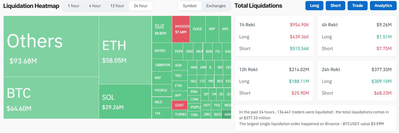 Gabungan faktor-faktor ini mendorong likuidasi harian hingga sekitar US$380 juta, dengan sebagian besar kerugian menimpa trader long yang bertaruh pada kenaikan harga. Trader long kehilangan US$310 juta, sementara trader short mengalami kerugian sebesar US$68,19 juta.