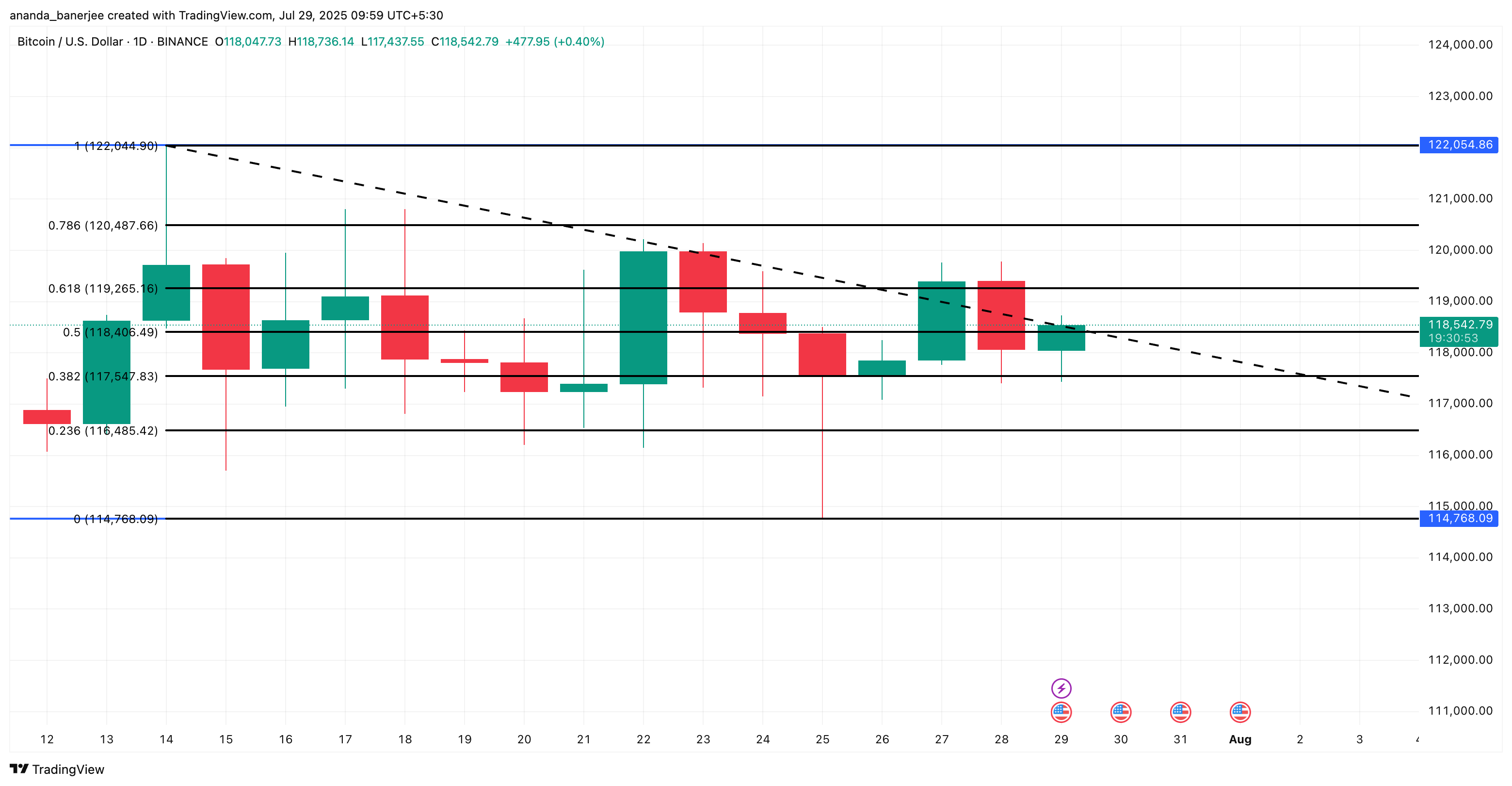 Meski beberapa upaya breakout di atas US$119.000 gagal, harga BTC masih di atas level support kunci US$117.000 dan US$118.000. Zona itu didukung oleh level retracement Fibonacci 0,382 dan 0,5, yang keduanya bertahan melalui beberapa kali pengujian.