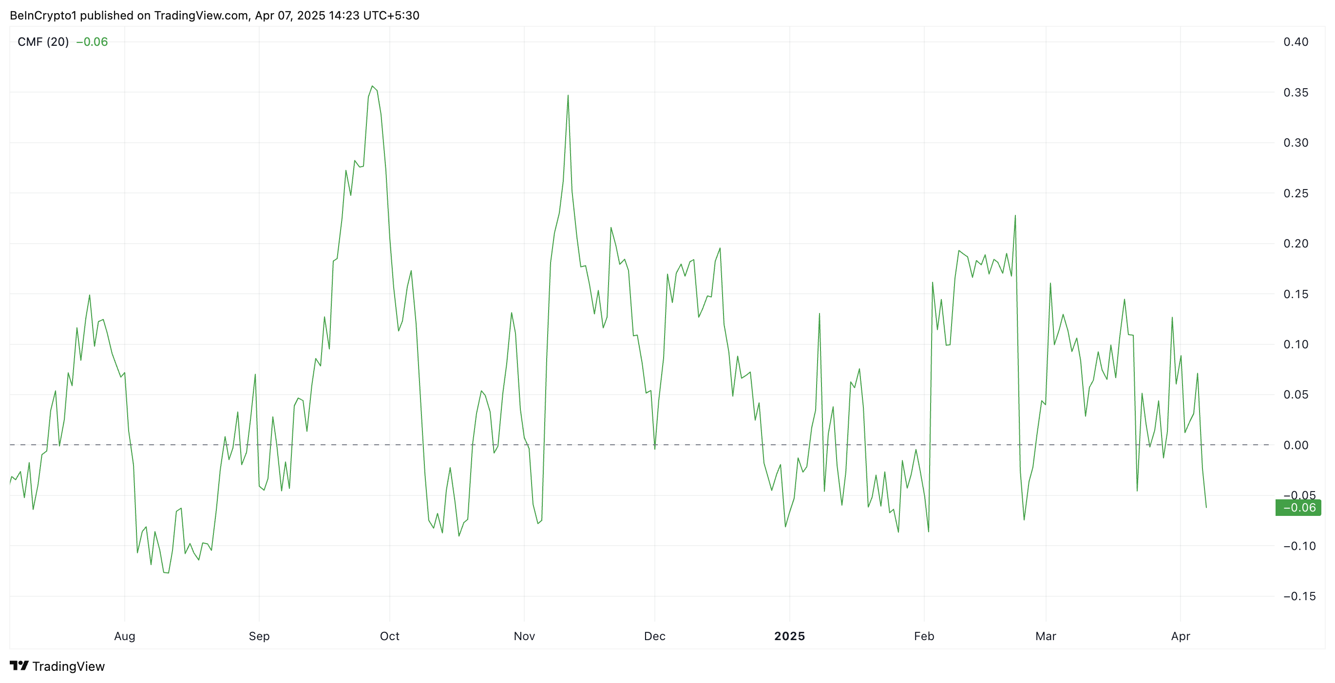 Indikator CMF mengukur akumulasi dan distribusi volume-berat dari sebuah aset selama periode tertentu, membantu mengukur tekanan beli dan jual. Ketika nilainya jatuh di bawah nol seperti ini, itu menunjukkan bahwa tekanan jual mendominasi.