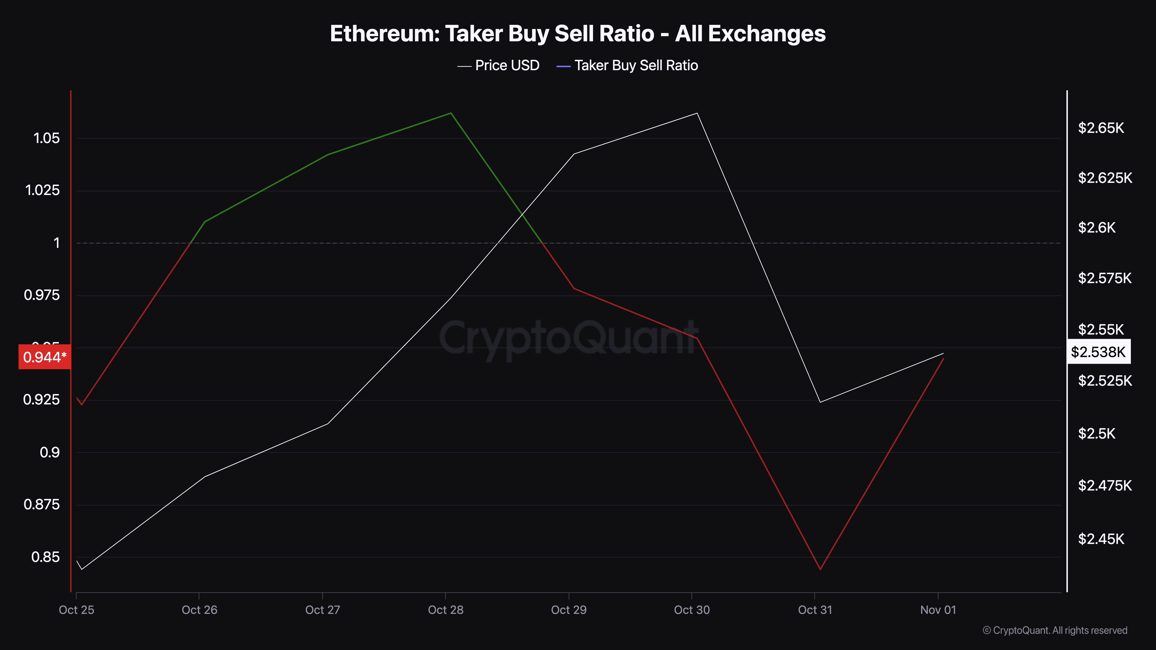 Ketika nilai di atas 1, itu berarti trennya bullish. Namun, nilai di bawah 1 berarti trennya bearish. Pada 31 Oktober, Rasio Pembelian/Penjualan Taker Ethereum adalah 0,84, yang berarti sentimen saat itu adalah bearish.