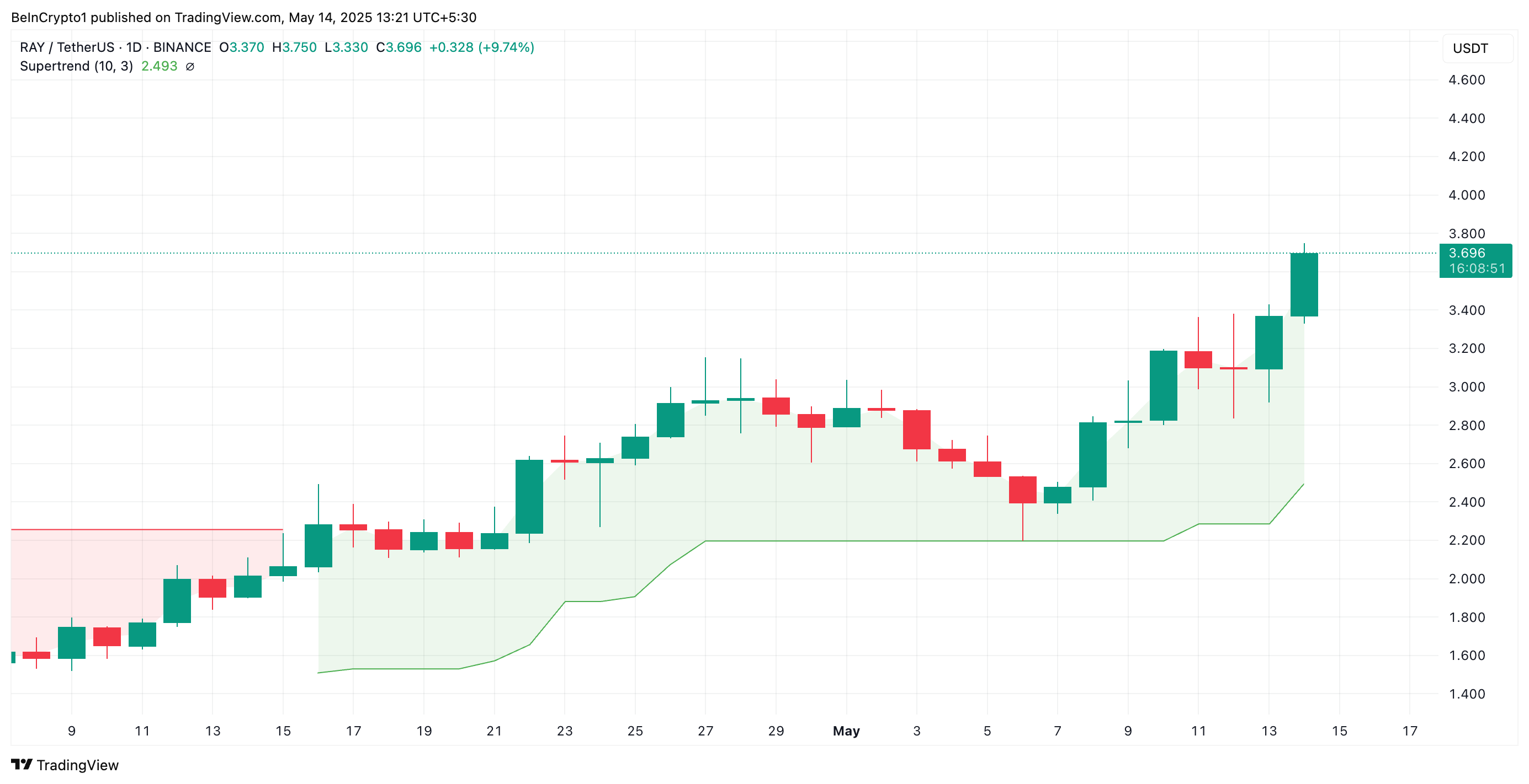 Sejak 8 April, token RAY telah mempertahankan tren naik yang stabil, mencatatkan harga tertinggi harian baru seiring momentum bullish meningkat. Dalam tujuh hari terakhir saja, harga token ini telah melonjak hampir 60%, mendorongnya ke harga tertinggi tiga bulan sebesar US$3,70 pada saat ini.