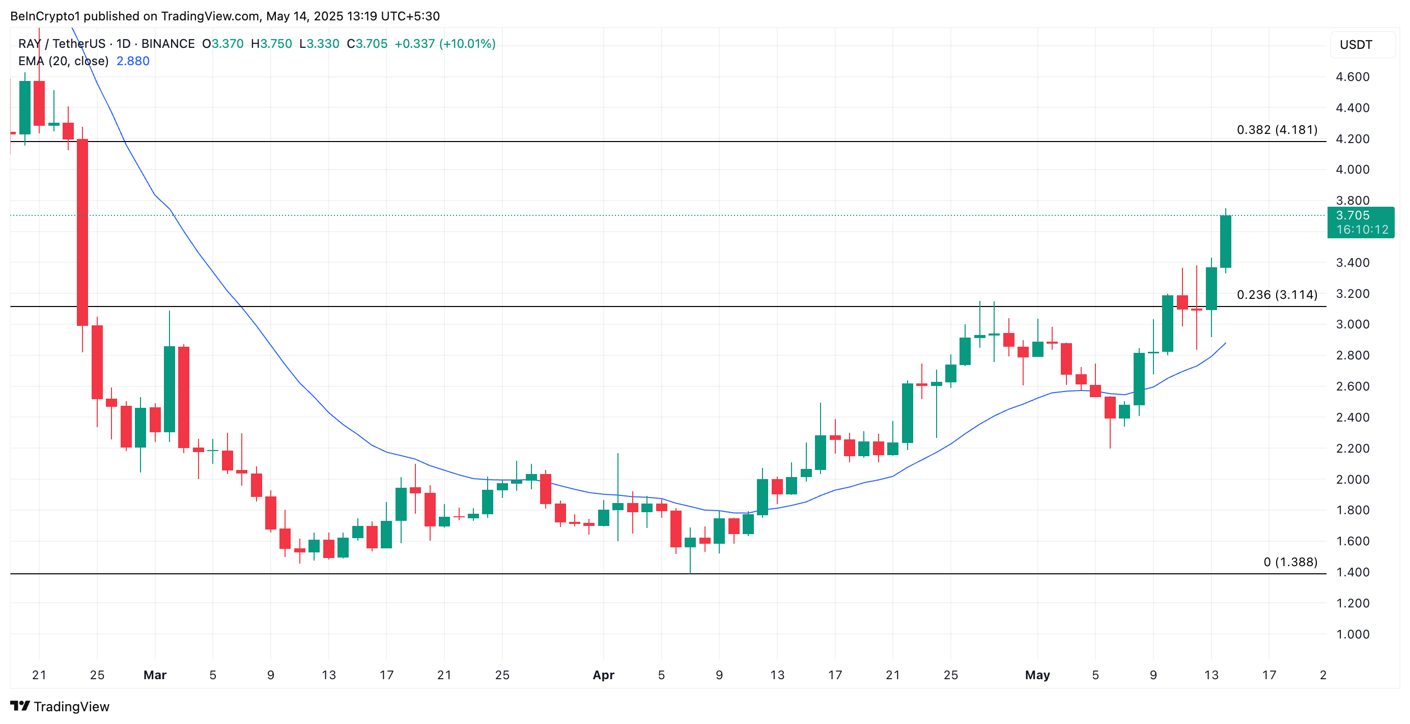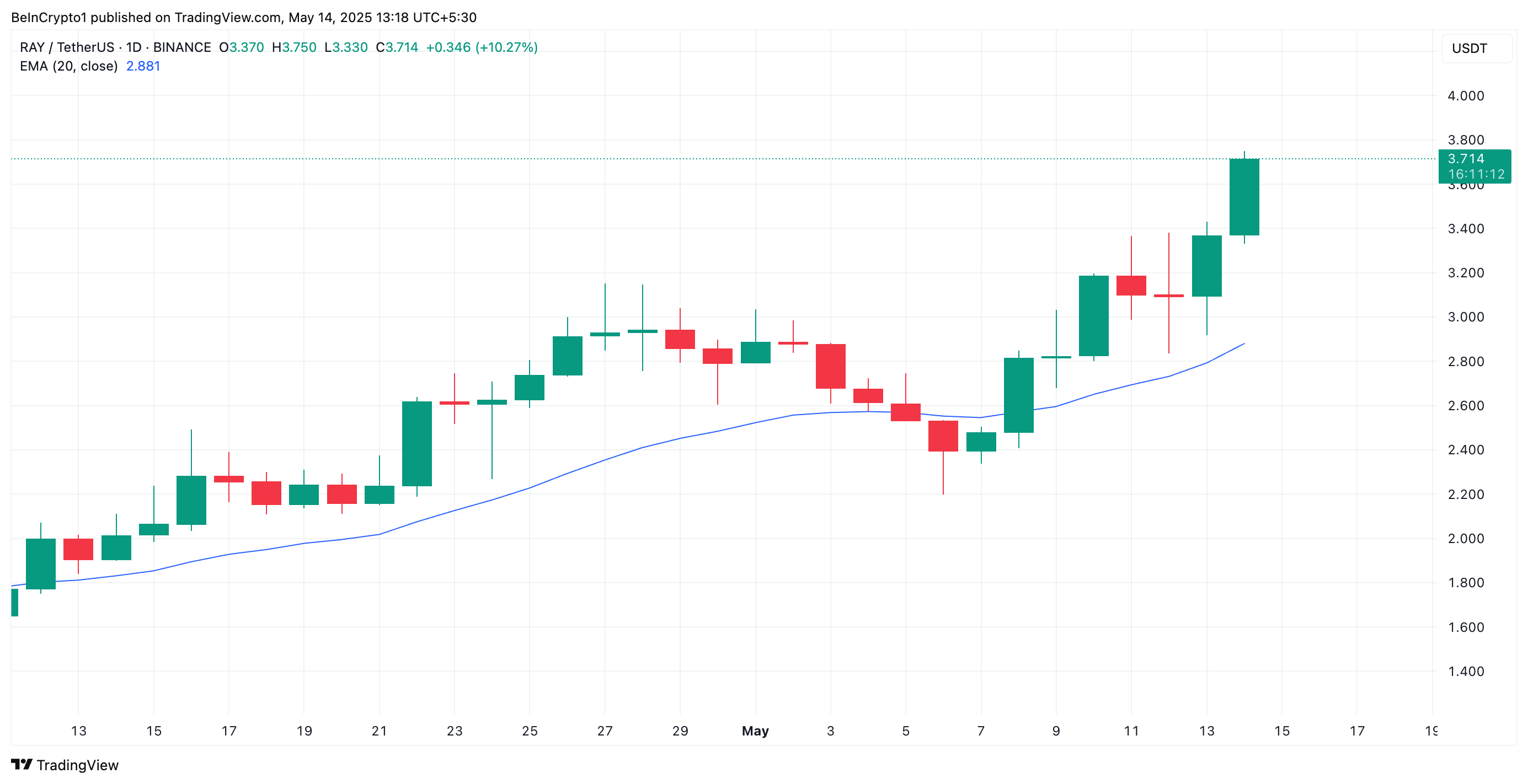 SponsoredKenaikan ini terjadi di tengah meningkatnya kepercayaan investor, karena token ini diperdagangkan jauh di atas Exponential Moving Average (EMA) 20 hari pada grafik harian. Rata-rata bergerak kunci ini membentuk support dinamis di bawah harga RAY, mencegahnya dari penurunan signifikan.