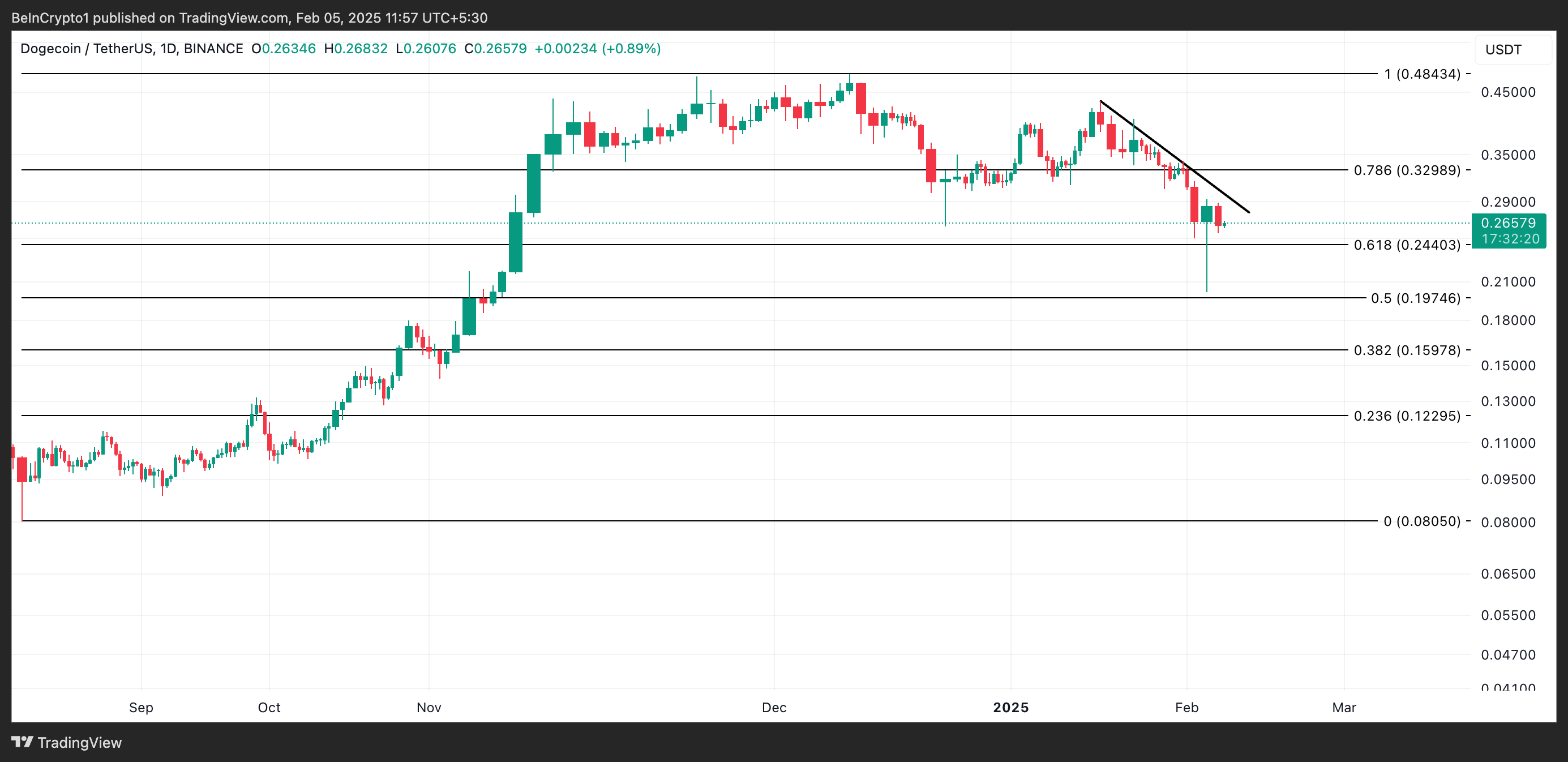 Sejak 18 Januari, DOGE berada di bawah garis tren menurun, dan nilainya telah turun 33%. Pola ini terbentuk ketika harga aset secara konsisten membuat puncak yang lebih rendah dari waktu ke waktu, menghubungkan titik-titik ini untuk menciptakan garis resistance yang miring ke bawah.