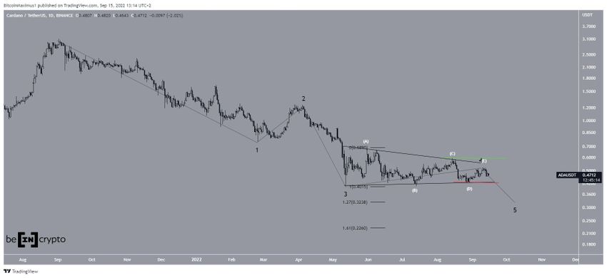 Sejak all-time high (ATH) ADA yang berhasil tercapai di bulan Agustus 2021 lalu, aset ini telah berada dalam tren turun lima gelombang (hitam). Sehubungan dengan hal ini, ADA sekarang berada di wave keempat yang bisa terlihat jelas dari bentuk segitiga simetrisnya.