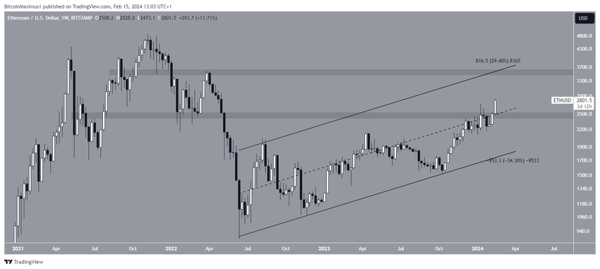 Kendati prediksi harga ETH ini bernada bullish, suksesnya penutupan di bawah level US$2.500 akan memicu penurunan sejauh 35% dari garis tren support naik saluran di US$1.800.