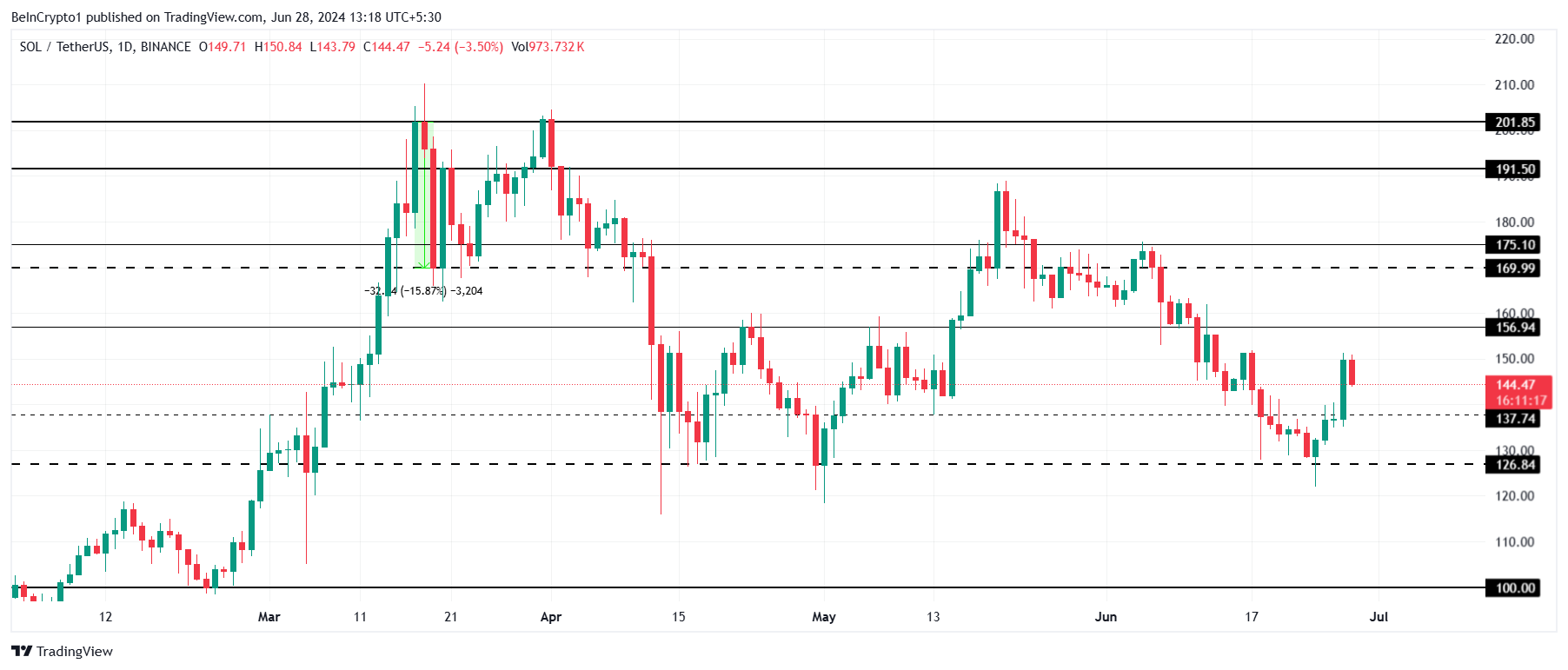 Namun, gagalnya SOL melancarkan breakout bakal menyeretnya turun ke US$126. Adapun level ini telah menjadi support dalam tiga bulan terakhir.