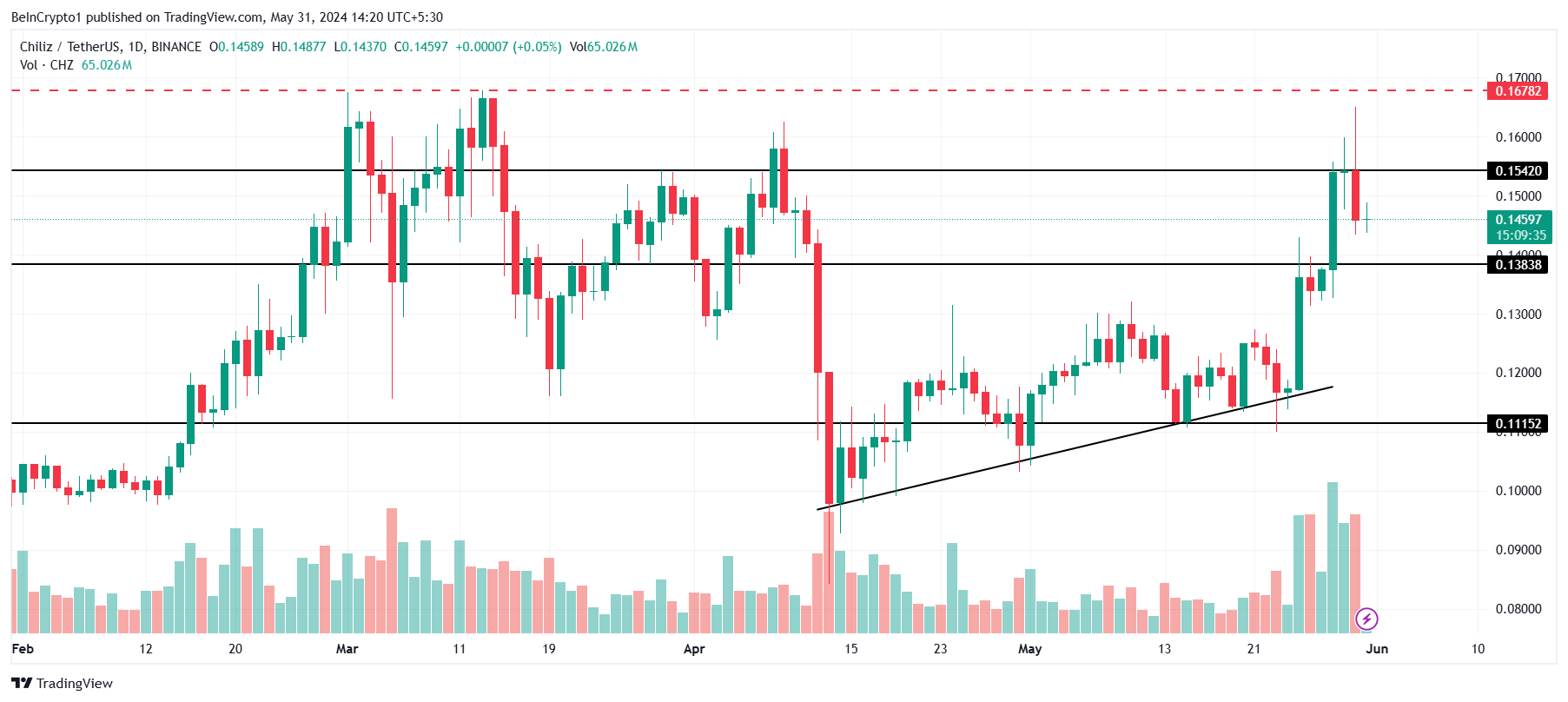 Hal ini, pada gilirannya, dapat menguntungkan CHZ berkat melambungnya penggunaan jaringan dan aset. Akibatnya, altcoin ini bisa mencetak angka US$0,154 dan menembus resistance US$0,167. Aksi ini berpotensi membentuk rekor tertinggi baru untuk tahun 2024.
