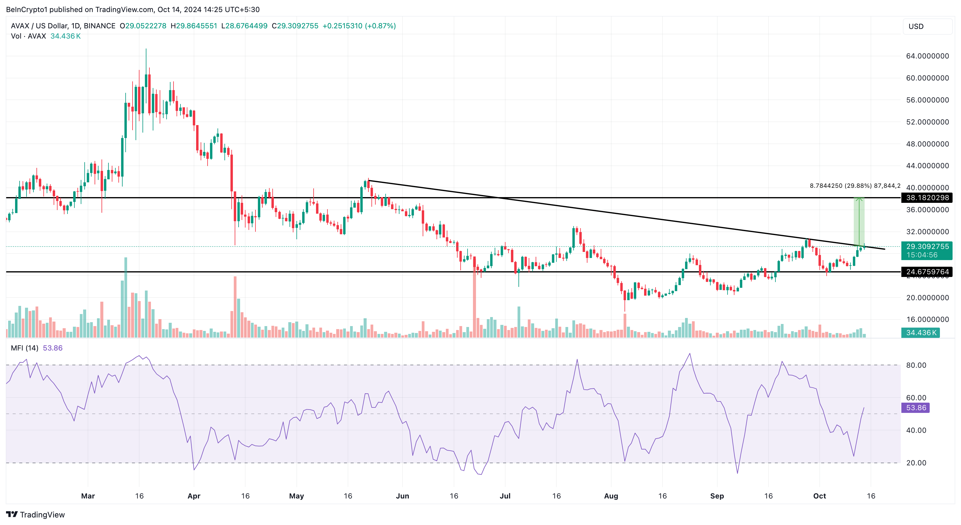Pada grafik harian, harga AVAX terekam bergerak mendekati angka US$30 untuk pertama kalinya di bulan Oktober. Jika tercapai, ini bisa menyokong altcoin ini menembus garis tren turun serta melambungkan harganya lebih tinggi.