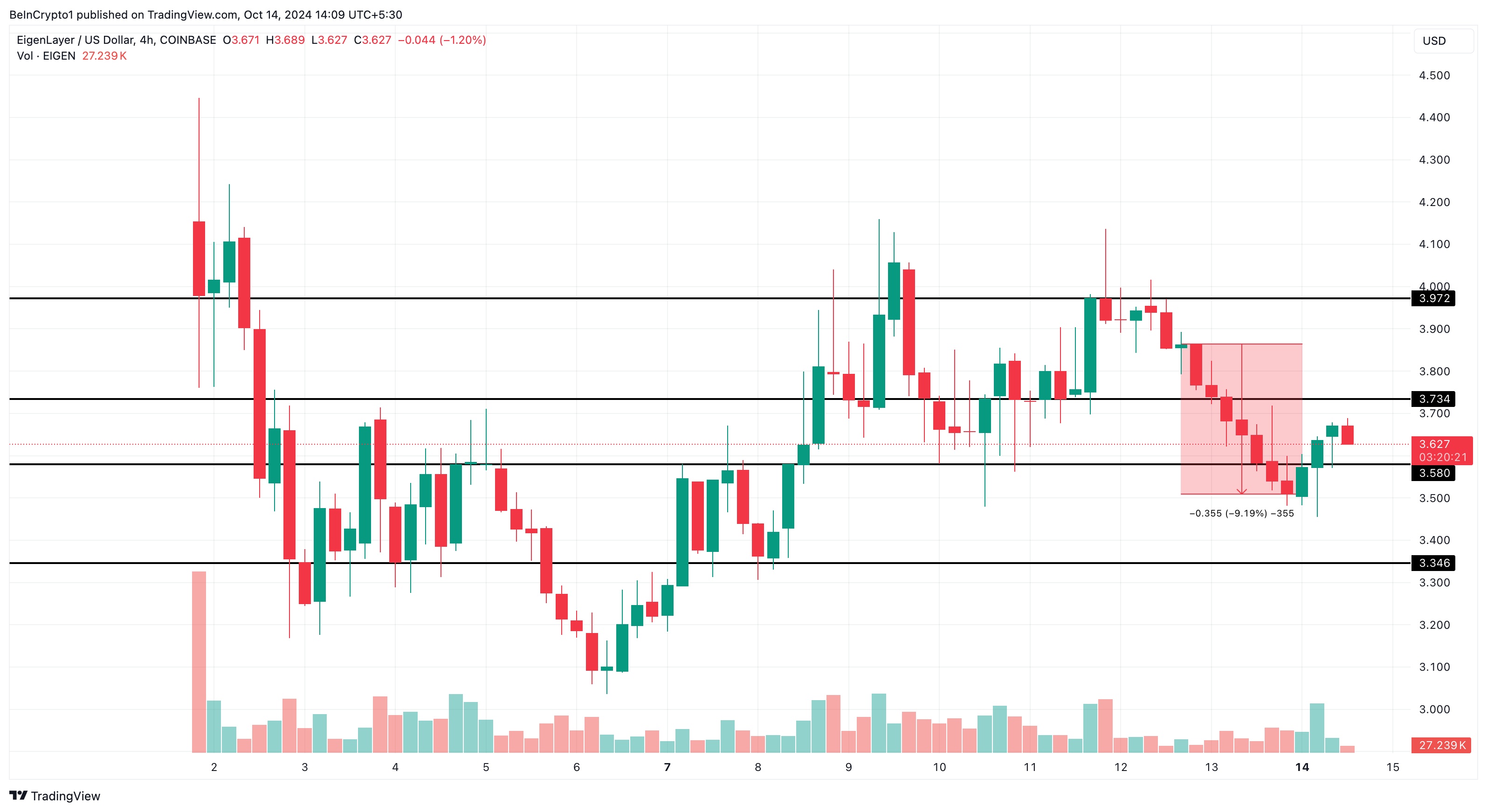 Namun, antara tanggal 12 sampai dengan 13 Oktober, EIGEN terpantau mengalami koreksi sedalam 9,19%. Kemarin (14/10), token ini membukukan rebound kecil. Walaupun altcoin ini bisa jadi menghadapi resistance di level US$3,73, support di US$3,58 nampaknya kokoh. Area support ini tentunya bisa dimanfaatkan kalangan bull untuk menembus penghalang tersebut.
