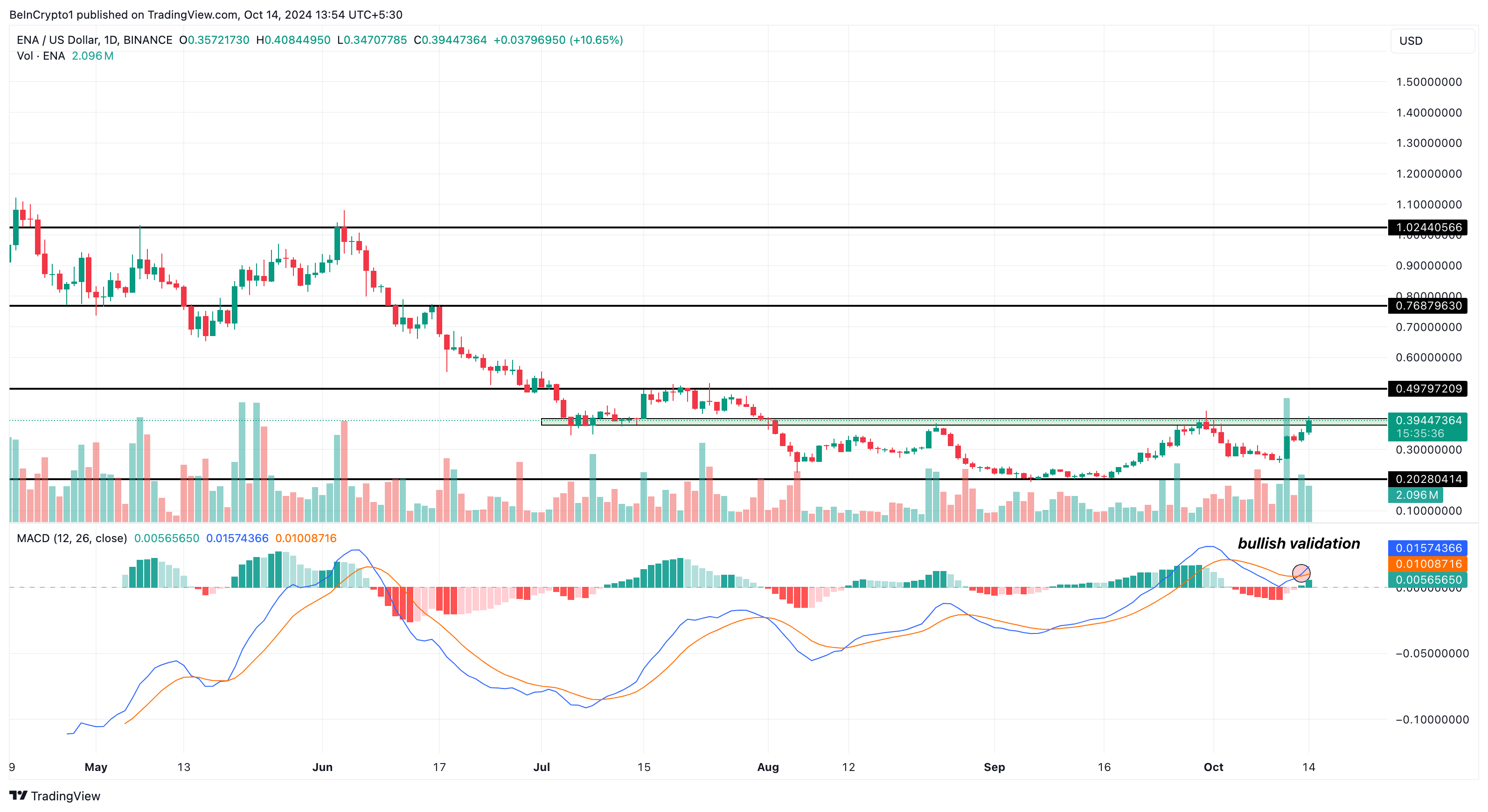 Menurut grafik harian, ENA sekarang tengah bersiap untuk menembus zona akumulasi di sekitar US$0,40. Indikator Moving Average Convergence Divergence (MACD) memancarkan pola crossover bullish. Hal ini dapat mengindikasikan tren naik yang lebih panjang.