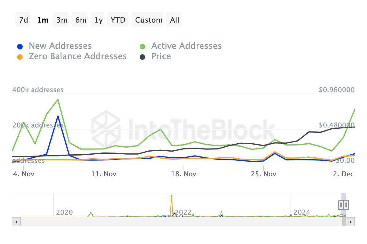 Menurut IntoTheBlock, alamat aktif Algorand melonjak menjadi 427.230 pada saat ini. Bagi yang belum familiar, alamat aktif merujuk pada jumlah dompet unik yang berhasil bertransaksi di blockchain.