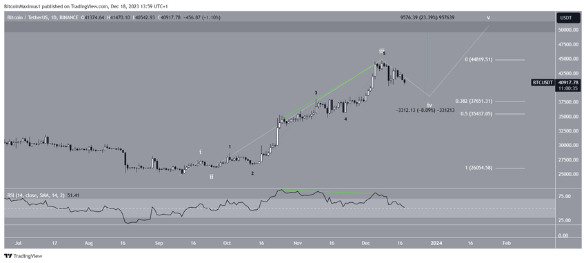 Target pertama untuk titik bottom gelombang empat adalah pada level support Fibonacci retracement 0,382 di US$37.650, atau 8% di bawah harga BTC saat ini.