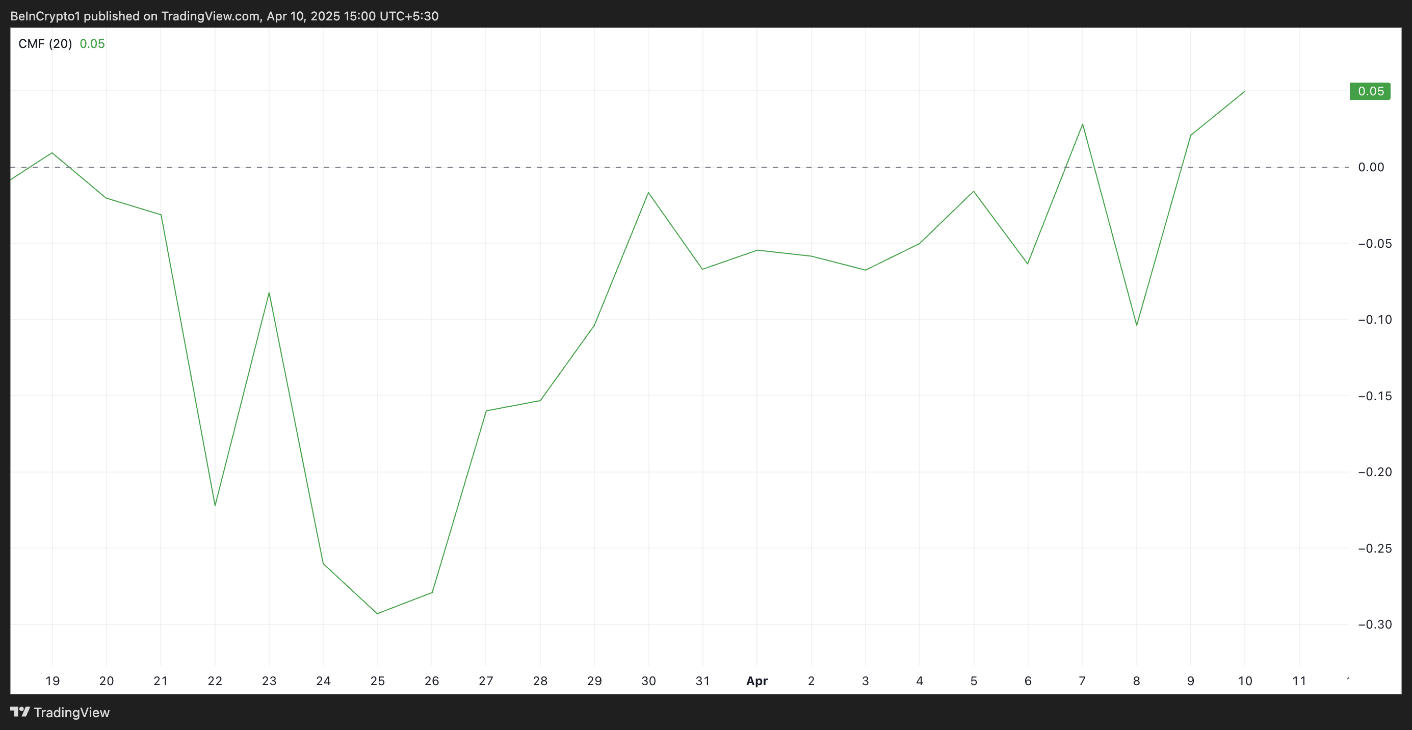 Pada waktu publikasi, indikator yang mengukur aliran dana masuk dan keluar dari suatu aset ini berada di atas garis nol di angka 0,05 dan sedang dalam tren naik.