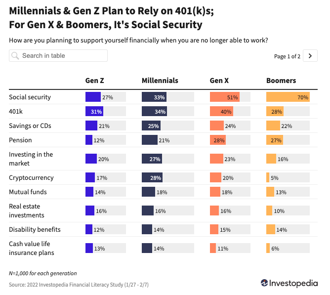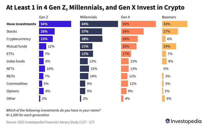 Cryptocurrency merupakan jenis investasi terpopuler kedua bagi Gen Z dan Gen X. Masing-masing memiliki porsi 23% dan 28% yang memiliki mata uang digital. Hanya 6% dari baby boomers yang disurvei Investopedia mengatakan mereka memiliki instrumen investasi dalam cryptocurrency.
