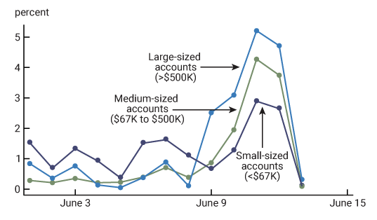 Para pemilik akun berukuran besar, mereka yang memiliki investasi berjumlah lebih dari US$500.000, menarik dana dengan tingkat tercepat dan secara proporsional lebih cepat daripada pemegang akun lainnya. Misalnya, pemilik akun dengan investasi lebih dari US$1 juta menghasilkan sekitar 35% dari semua penarikan di Celsius.