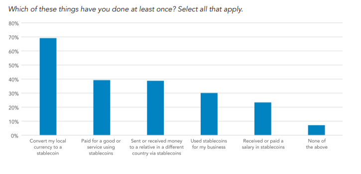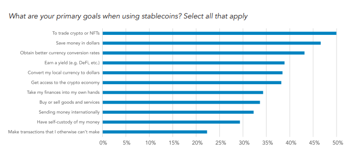 Secara keseluruhan, 47% responden memperlihatkan indikasi bahwa tujuan utama mereka menggunakan aset kripto ini adalah untuk menghemat uang dalam dolar, dan 39% responden lain mengatakan sengaja menggunakan stablecoin untuk mendapatkan keuntungan.