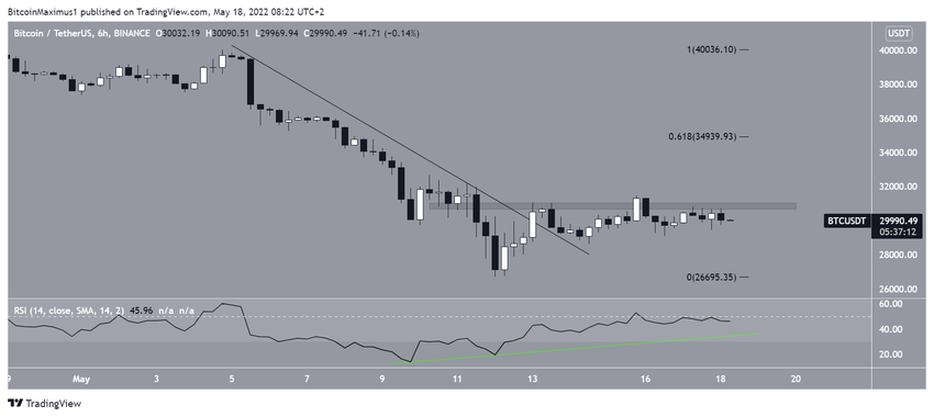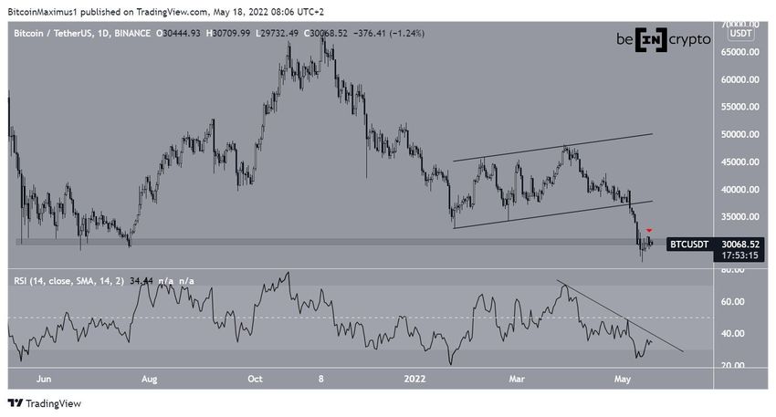 Indikator RSI BTC dalam grafik harian mendukung resistance di titik US$30.500, karena indikator tersebut mengikuti garis descending resistance yang selaras dengan level ini.