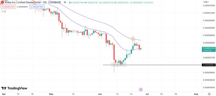 Harga sempat melonjak awal pekan lalu, melewati Exponential Moving Average (EMA) 20 hari pada grafik harga harian dan mencapai level tertinggi US$0,00000846.