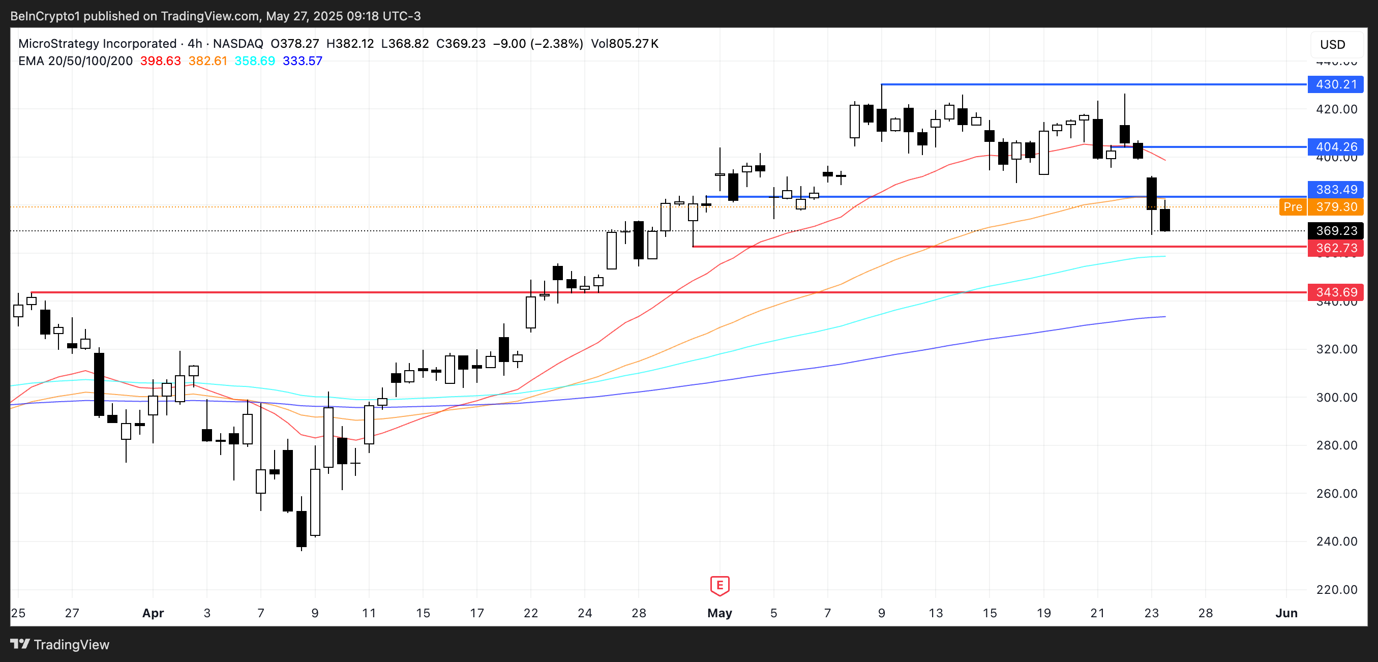 Level US$362 berdiri sebagai support krusial—jika hilang, pergerakan menuju US$343 menjadi mungkin. Namun, pembalikan bullish yang mendorong MSTR di atas resistance saat ini di US$383 dapat membuka jalan untuk retest zona US$404 dan merebut kembali level US$400.