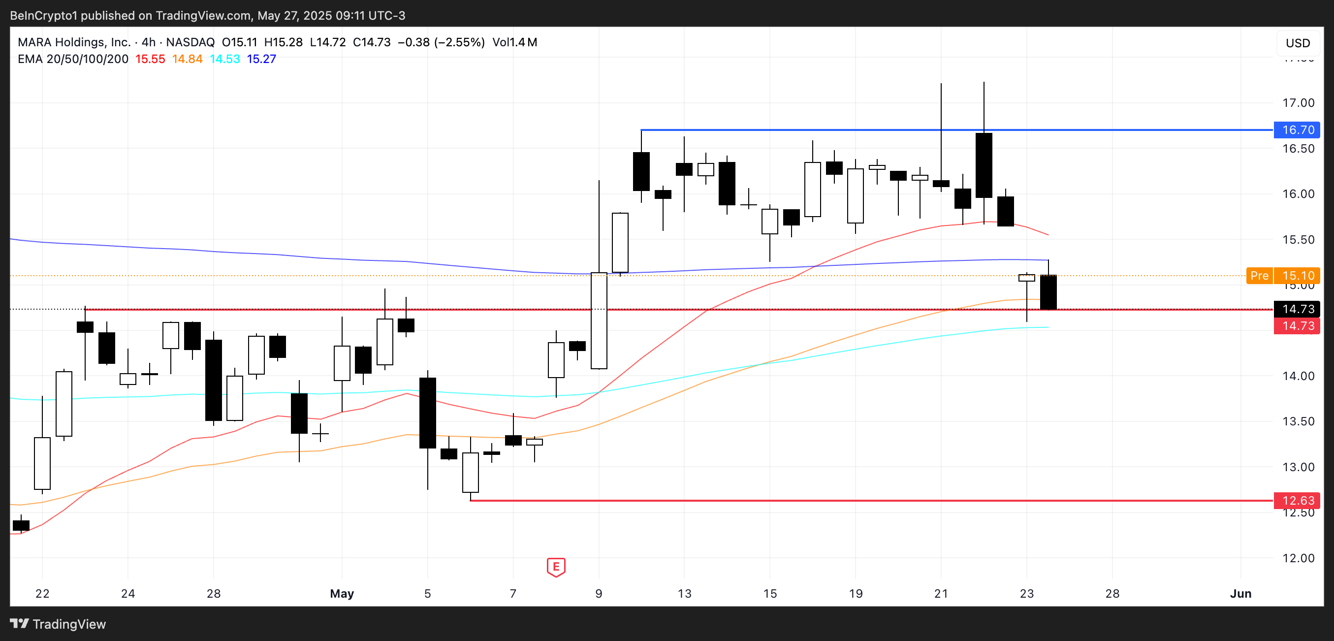 MARA menutup perdagangan Jumat lalu turun 5,88%, berakhir di US$14,73, namun melihat pemulihan 2,38% dalam perdagangan pre-market. Saham ini saat ini berada di dekat level support kritis—jika level tersebut pecah, target penurunan berikutnya bisa menjadi US$12,63.