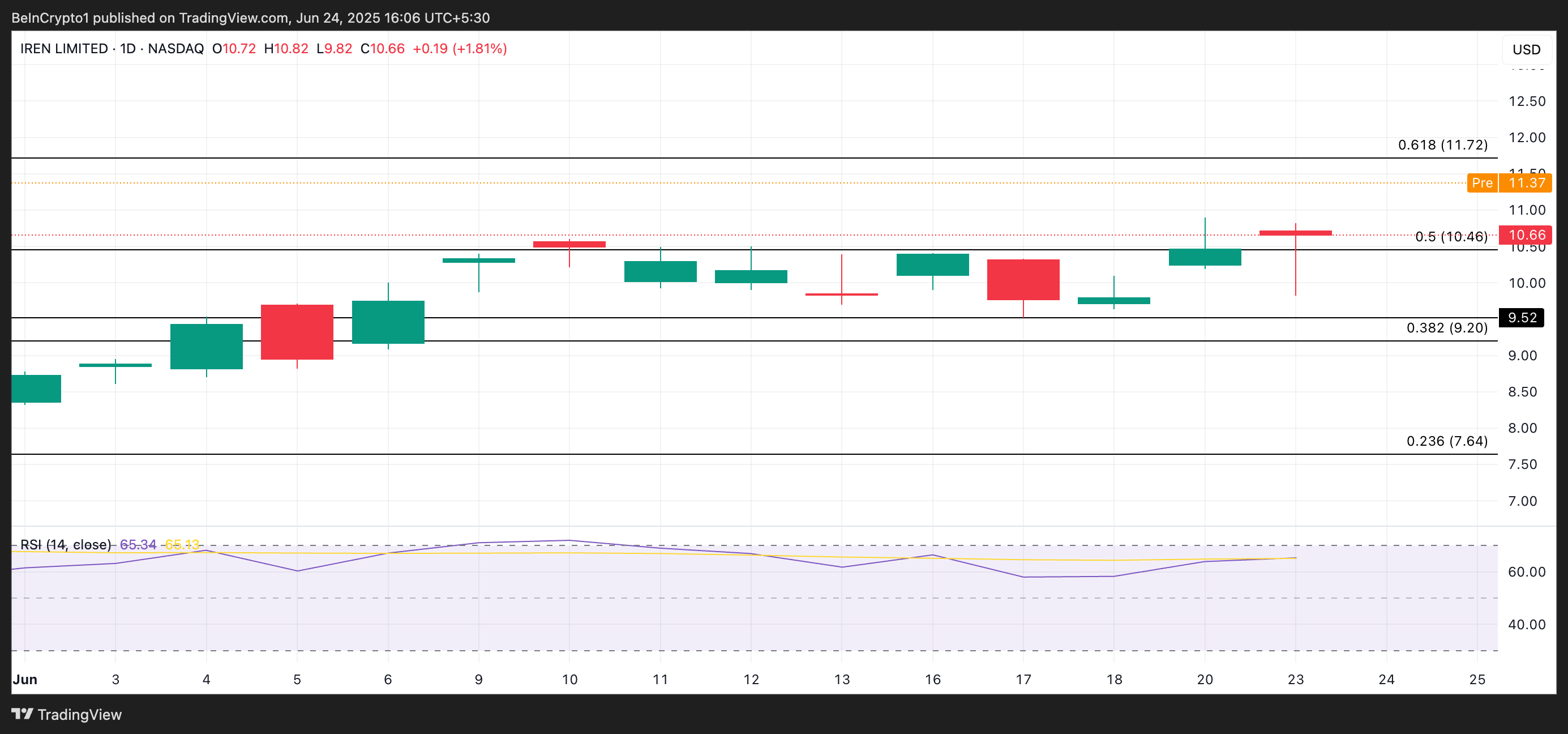 Pada grafik harian, Relative Strength Index (RSI) IREN berada di 65,34 dan dalam tren naik, menandakan permintaan tinggi untuk aset tersebut.