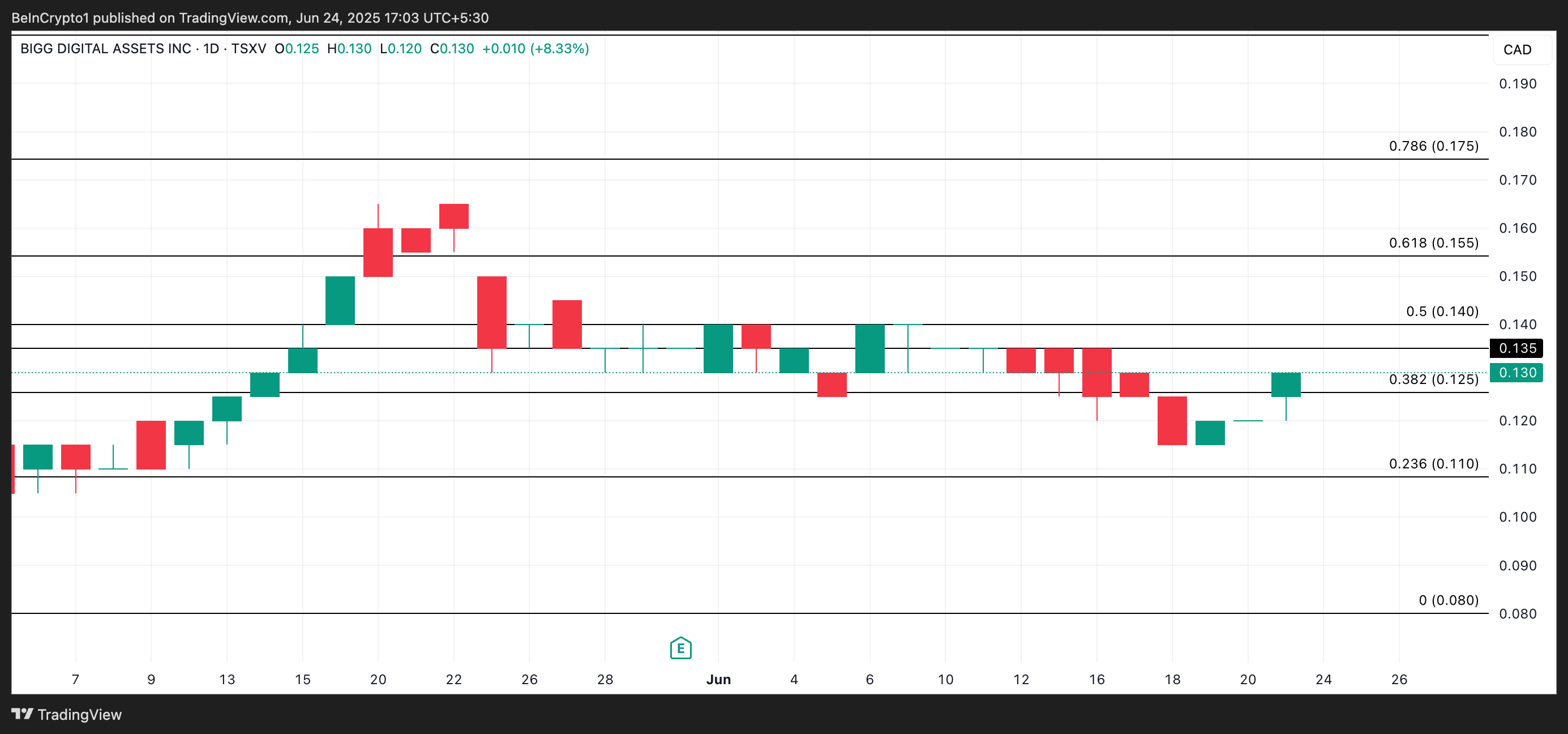 BIGG ditutup dengan kuat pada hari Senin, dengan saham melonjak 4%. Jika volume perdagangan meningkat lebih lanjut setelah perdagangan dilanjutkan hari ini, BIGG bisa memperpanjang keuntungannya dan naik menuju US$0,135.