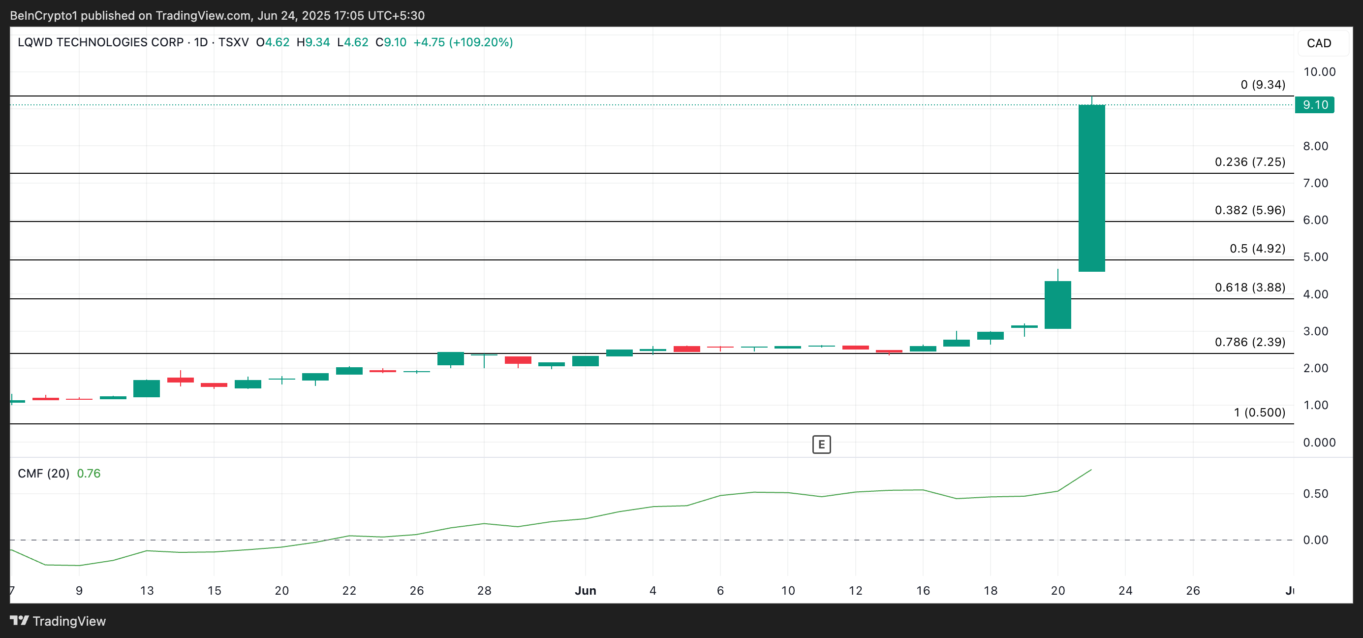 Bacaan dari grafik satu hari LQWD/USD menunjukkan bahwa saham tersebut naik ke level tertinggi sepanjang masa sebesar US$9,34 selama sesi Senin. Pada hari itu, Chaikin Money Flow (CMF) juga naik ke level tertinggi 0,76, mengonfirmasi permintaan tinggi untuk saham tersebut.