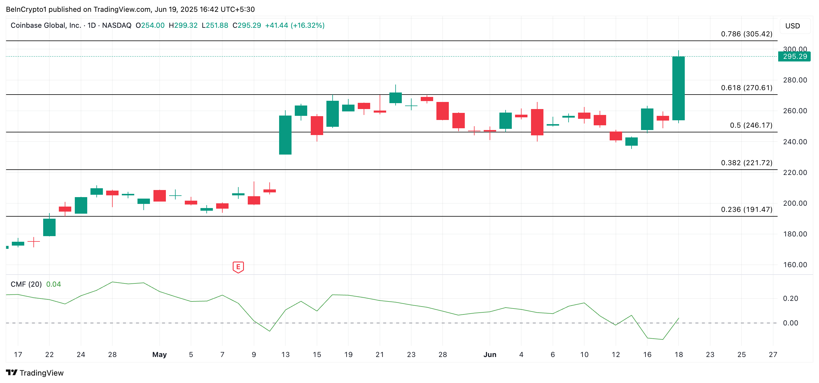 Indikator CMF mengukur bagaimana uang mengalir masuk dan keluar dari sebuah aset. Pembacaan di atas nol seperti ini menunjukkan bahwa tekanan beli dominan di antara para trader. Jika ini berlanjut, bisa mendorong harga COIN di atas US$305,42.