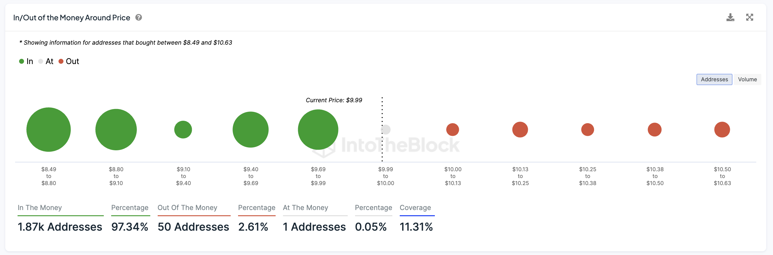 Grafik In/Out of the Money Around Price (IOMAP) menunjukkan area hijau yang substansial di bawah harga WLD saat ini. Ini menjadi pertanda bahwa mayoritas investor berada dalam posisi ‘In the Money’ atau menguntungkan. Di samping itu, juga terlihat bahwa WLD memiliki zona support yang bagus di US$9,69 dan US$9,40. Namun, jika harga gagal mempertahankan zona support ini, WLD bisa tergelincir sampai ke level US$9,10. Penurunan ini akan mewakili koreksi sebesar 7%.