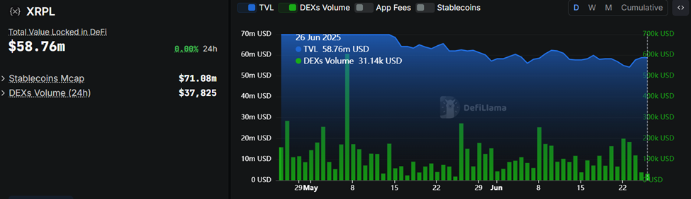 Meski memiliki visi institusional, aktivitas di XRPL DEX tetap sangat rendah. Menurut data di DefiLlama, volume 24 jam berada di bawah US$50.000, dan total value locked (TVL) di XRPL di bawah US$60 juta.
