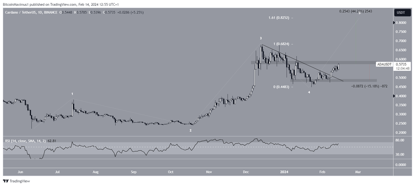 Di samping itu, indikator wave count juga menyokong kenaikan yang sedang berlangsung ini. Sebagai informasi, teori Elliott Wave melibatkan analisis pola harga jangka panjang yang berulang dan psikologi investor untuk menentukan arah tren. Adapun wave count yang paling mungkin terjadi menunjukkan bahwa ADA sekarang berada di gelombang kelima dan terakhir dari tren naik yang bermula sejak Juni 2023 (putih).