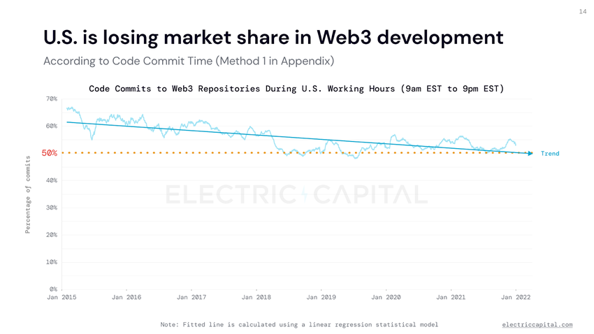 Amerika Serikat (AS) kehilangan pangsa pasarnya secara keseluruhan dalam hal developer Web3, berdasarkan data dari laporan perusahaan modal ventura kripto, Electric Capital.