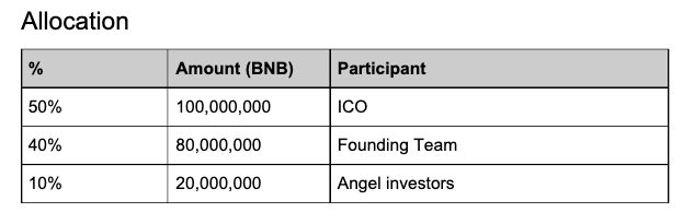 Sebanyak 100 juta BNB dijual melalui ICO yang berlangsung di berbagai platform di seluruh dunia. Sementara sebanyak 80 juta BNB dijelaskan dicadangkan untuk para tim pendiri Binance yang termasuk sang pemimpin yaitu Changpeng ‘CZ’ Zhao. Sementara 20 juta BNB dialokasikan untuk angel investors Binance.