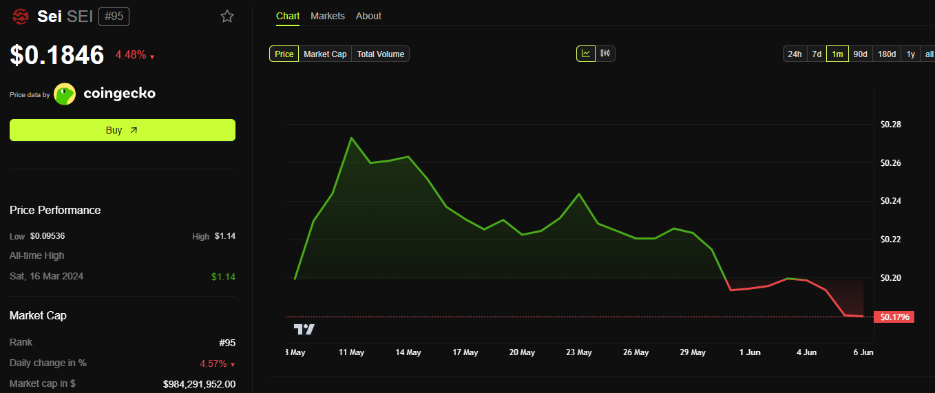 Meski pengembangan ekosistemnya kuat, harga SEI gagal mencerminkan pertumbuhan ini. Menurut BeInCrypto, harga SEI turun lebih dari 30% pada Mei 2025. Penurunan ini menimbulkan kekhawatiran di kalangan investor.
