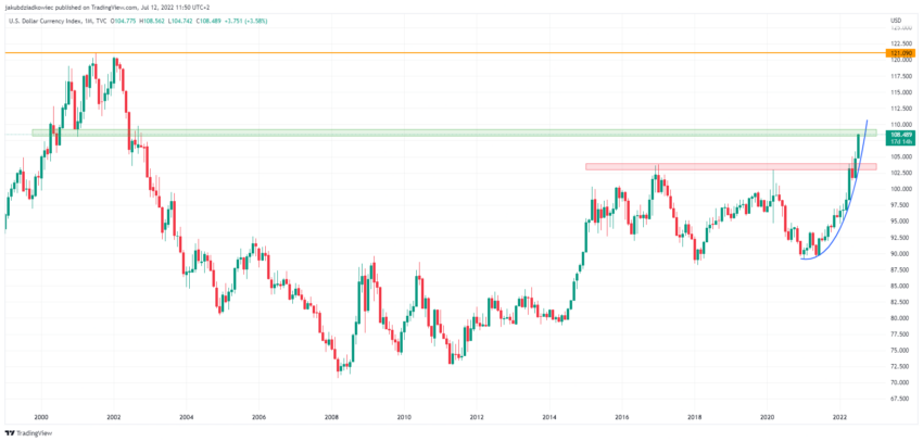 Level perdagangan DXY saat ini berkisar pada level antara 108-109 (hijau), yang merupakan area dengan potensi resistensi yang lebih kecil. Jika ini berhasil ditembus, maka level berikutnya mungkin tidak akan terlihat sampai puncak 121 pada bulan Juli 2001 (garis oranye).
