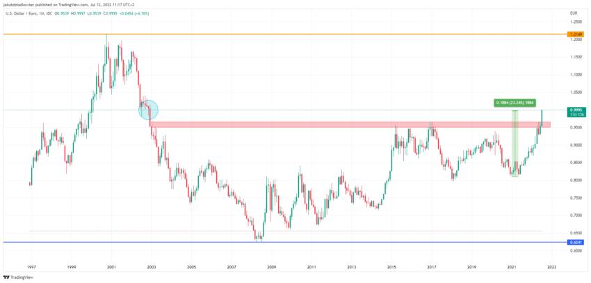 Level paritas terakhir kali yang terjadi antara dua mata uang ini muncul pada akhir tahun 2002 silam. Tepatnya, ketika euro mulai diperkenalkan ke dalam sirkulasi uang tunai (lingkaran biru). Sejak saat itu, kisaran EUR 0,95-0,96 terus bertindak sebagai titik resistance (merah) pada tahun 2015 dan 2017.