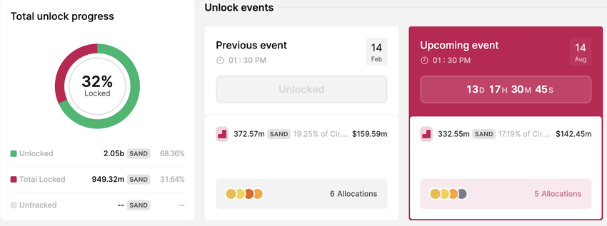 Tepat pada tanggal 14 Agustus mendatang, proyek ini akan merilis sebanyak 332,55 juta token SAND senilai US$142,45 juta ke dalam sirkulasi. Agenda unlock token ini mencakup 17,19% dari total pasokan yang beredar.
