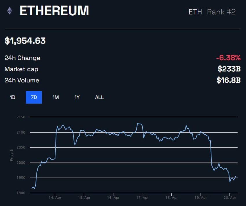 Terlepas dari berbagai rencana Ethereum dalam roadmap mereka, nampaknya harga Ether (ETH), native token Ethereum, terpantau sedang mengalami koreksi. Tepat setelah upgrade Shapella terlaksana, harga ETH sempat terapresiasi lebih dari 10% hingga menembus di atas level US$2.000. Namun, pada saat penulisan, ETH sedang diperdagangkan di kisaran US$1.950 atau turun 6,4% di hari ini.
