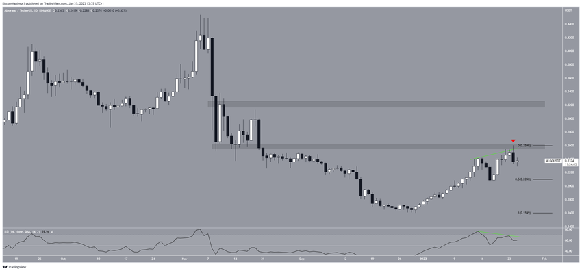 Ada dua alasan untuk ini. Pertama, harga ALGO ditolak oleh area resistance jangka pendek US$0,26 (ikon merah). Kedua, indikator RSI hariannya menghasilkan pola bearish divergence.