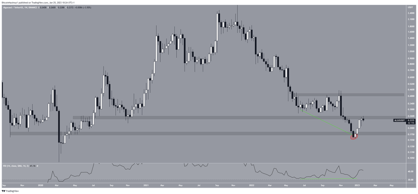 Sementara itu, indikator RSI mingguannya menunjukkan sinyal bullish karena harga ALGO sudah naik setelah menghasilkan pola bullish divergence (garis hijau). Alhasil, aksi breakout sedikit di atas level US$0,18 lebih berpeluang akan terjadi.