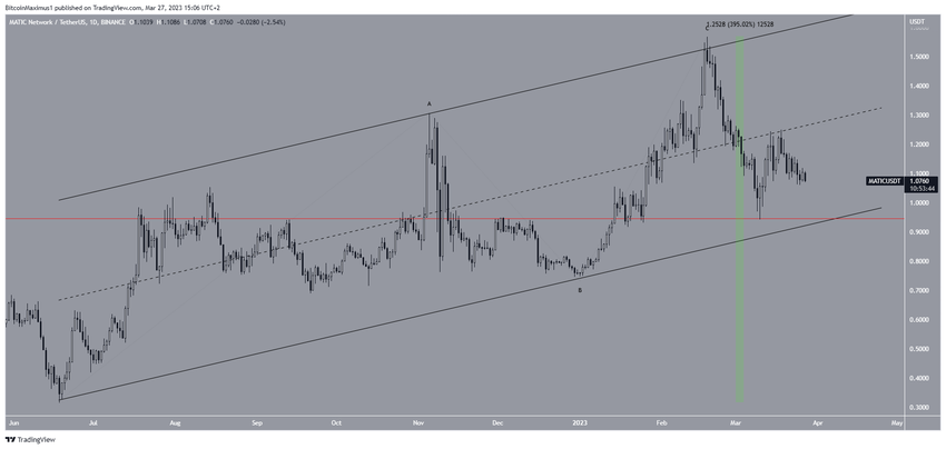 Analisis teknikal dari time frame hariannya menunjukkan bahwa seluruh kenaikan harga token MATIC yang mencapai 394% sejak bulan Juni 2022 terjadi di dalam ascending parallel channel. Karena channel semacam ini biasanya berisi struktur korektif, maka seluruh peningkatan yang sudah terjadi mungkin merupakan struktur korektif A-B-C (hitam).
