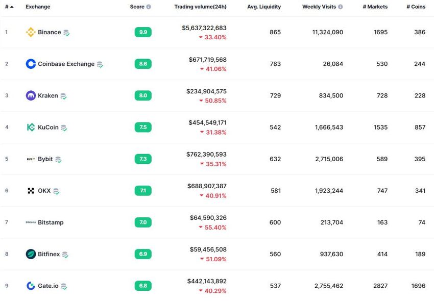 Menurut CoinMarketCap, volume perdagangan di sembilan crypto exchange teratas telah anjlok antara 30% hingga 55% selama 24 jam terakhir.
