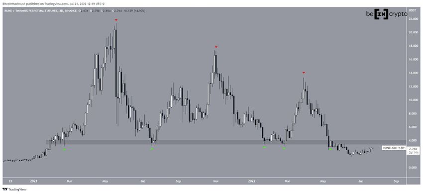 Pergerakan harga RUNE terus mengalami penurunan sejak mencapai harga tertingginya sepanjang masa, tepatnya di level US$21,30 pada bulan Mei 2021 lalu. Sejak capaian itu juga, RUNE telah mencetak tiga level harga tertinggi yang lebih rendah (ikon merah).