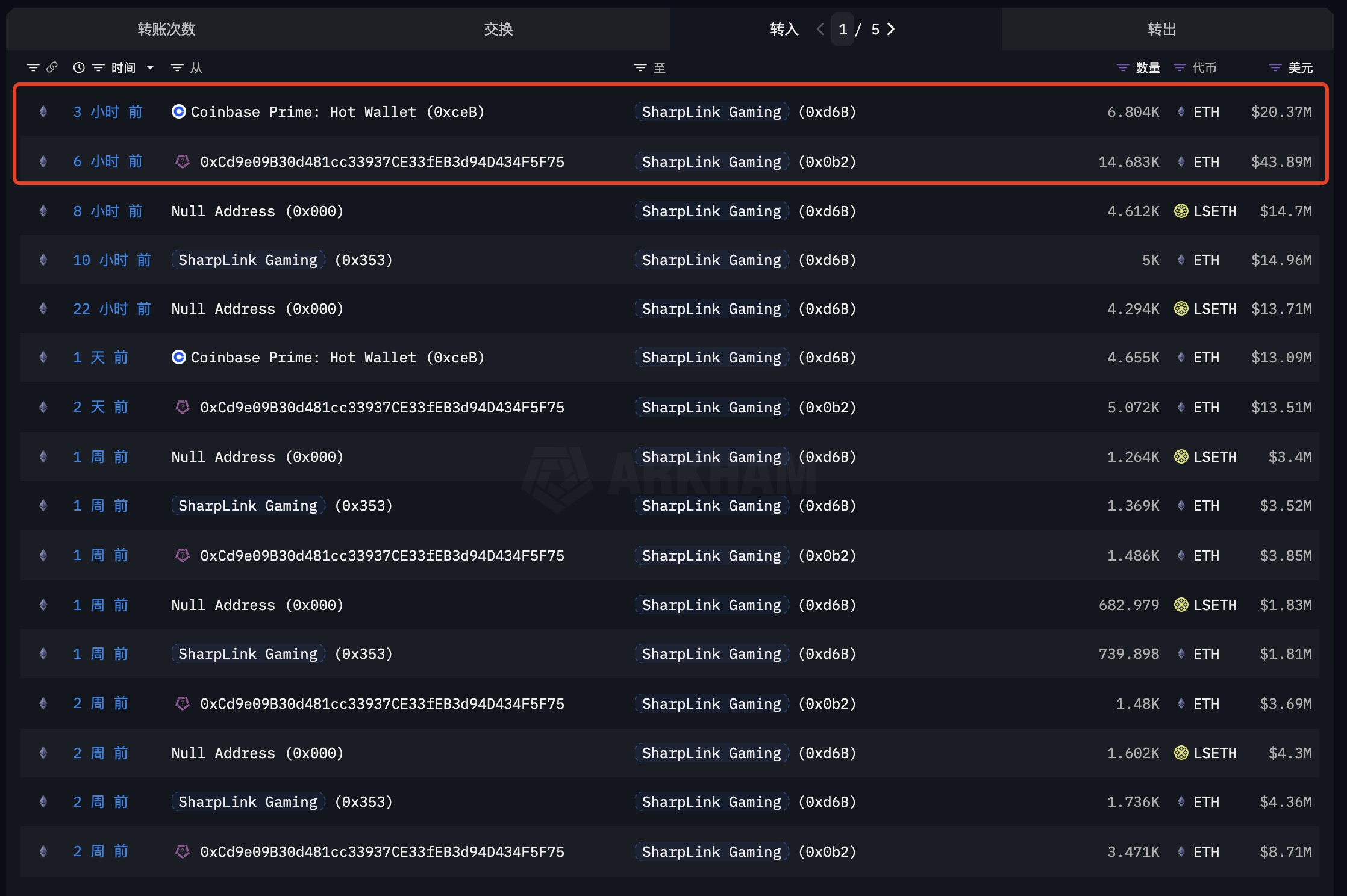 Menurut data blockchain yang dilacak oleh EmberCN melalui Arkham Intelligence, Sharplink membeli 21.487 ETH pada 12 Juli, senilai US$64,26 juta.